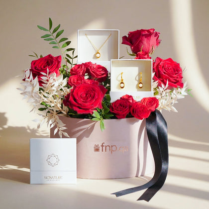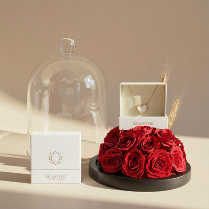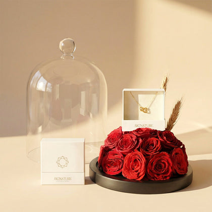 قلادة القلوب المتشابكة المميزة مع مجموعة هدايا رائعة من الورود الحمراء