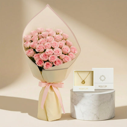 قلادة القلب الذهبي مع باقة الورود الوردية - هدية مثالية للحب والأناقة