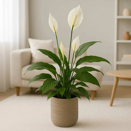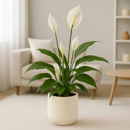 زنبق السلام الأنيق في وعاء سيراميك أبيض حديث - ديكور داخلي مثالي