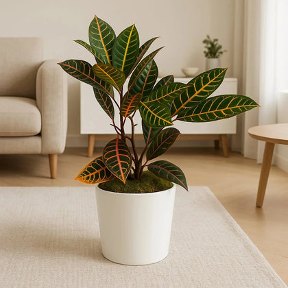 نبات الكروتون الاستوائي النابض بالحياة في وعاء أنيق بتشطيب رخامي