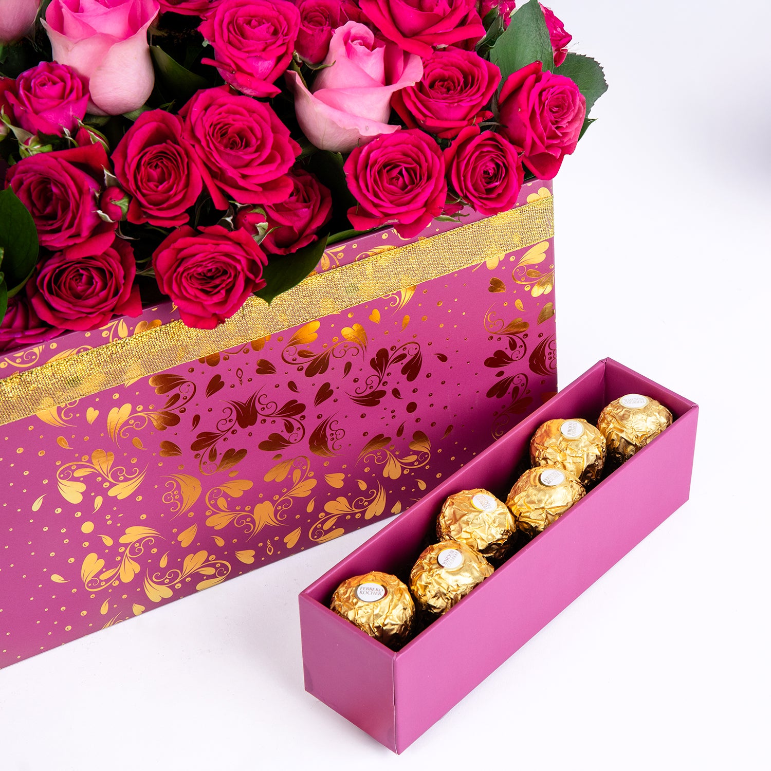 Elegant Pink Flower Arrangement with Ferrero Rocher in a Luxurious Box