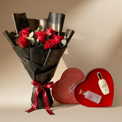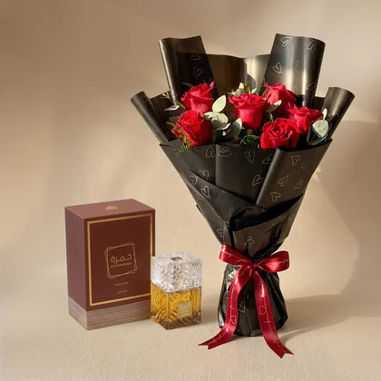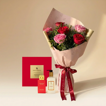 Eternal Romance: Pink & Red Roses with Shaghaf Oud Ahmar Gift Set