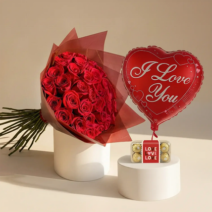 Ultimate Valentine Romance Combo: Roses, Balloon & Chocolates