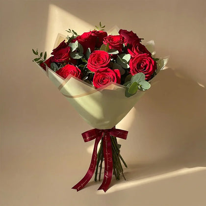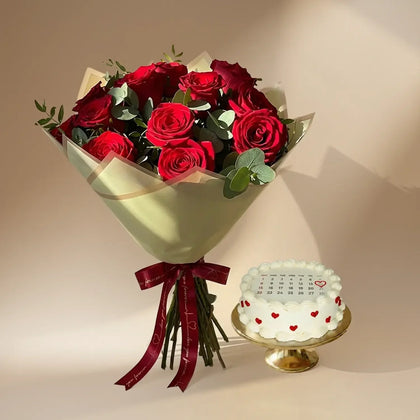Romantic Red Roses Bouquet with Decadent Chocolate Mousse Cake