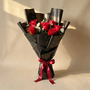 Perfect for conveying love and admiration, this bouquet is wrapped in elegant black paper with a red ribbon, making it an ideal gift for any special occasion.
