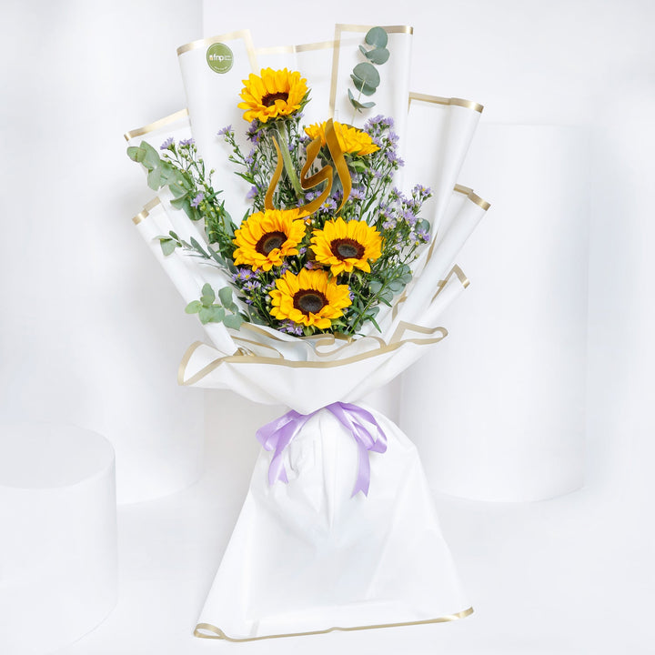 - Bouquet: Featuring 5 radiant sunflowers, 4 delicate blue asters, and 3 aromatic eucalyptus stems, all beautifully wrapped in pristine white sheets and adorned with a charming purple ribbon.