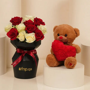 Delight your loved ones with our Elegant Peach and Red Rose Bouquet beautifully wrapped in a sophisticated black flower sleeve. This charming arrangement features:
